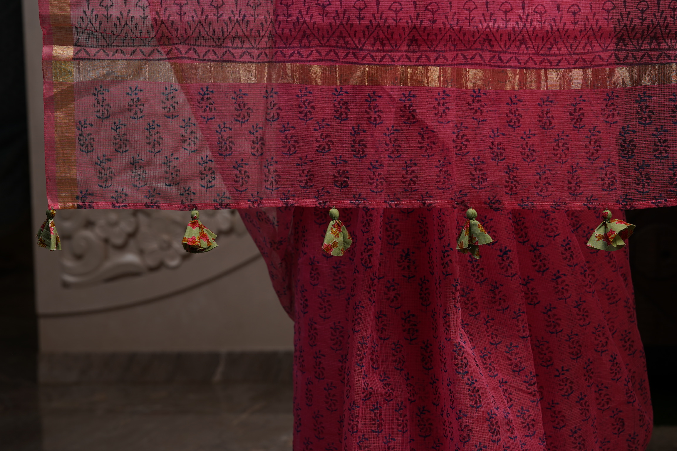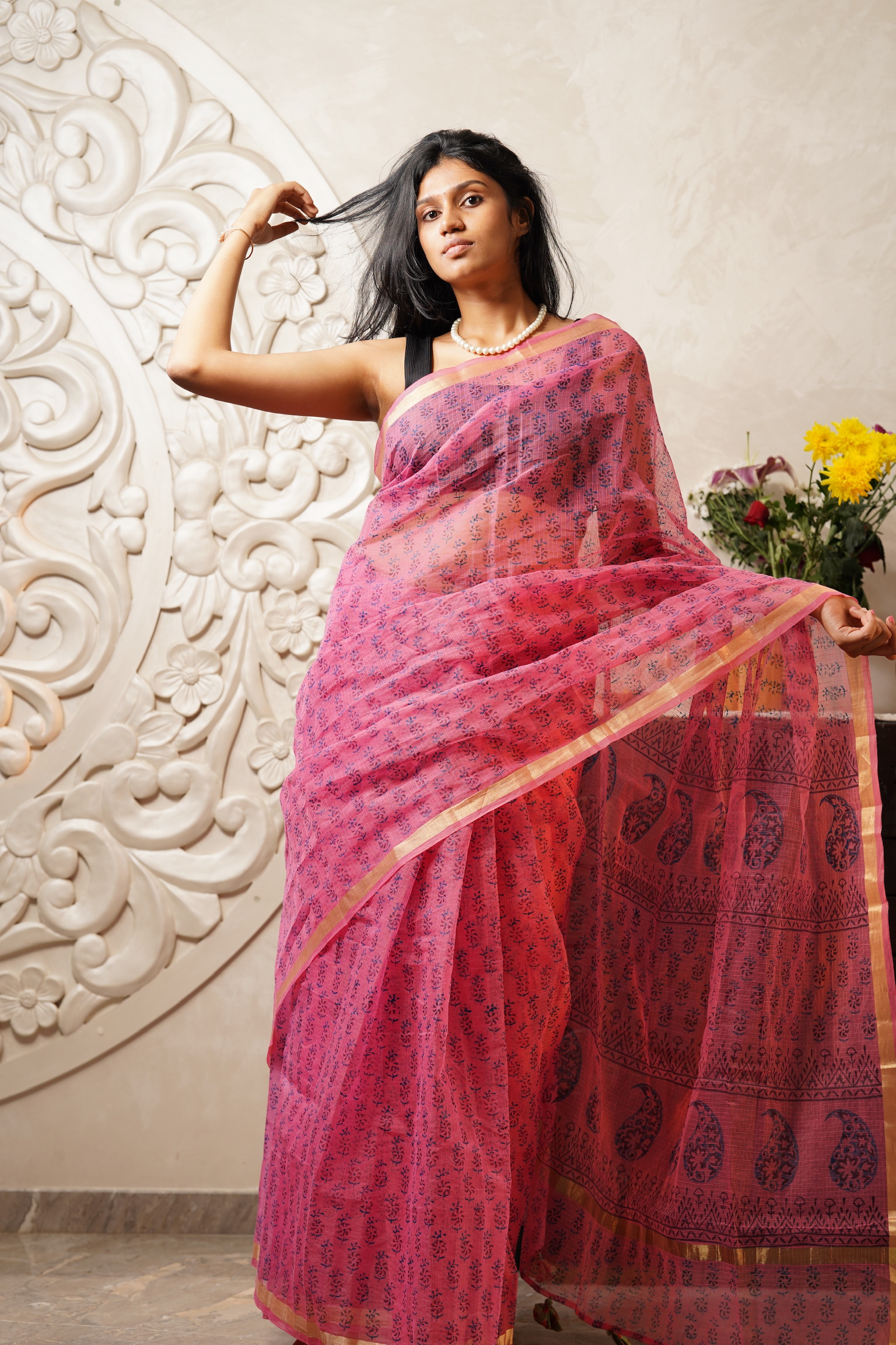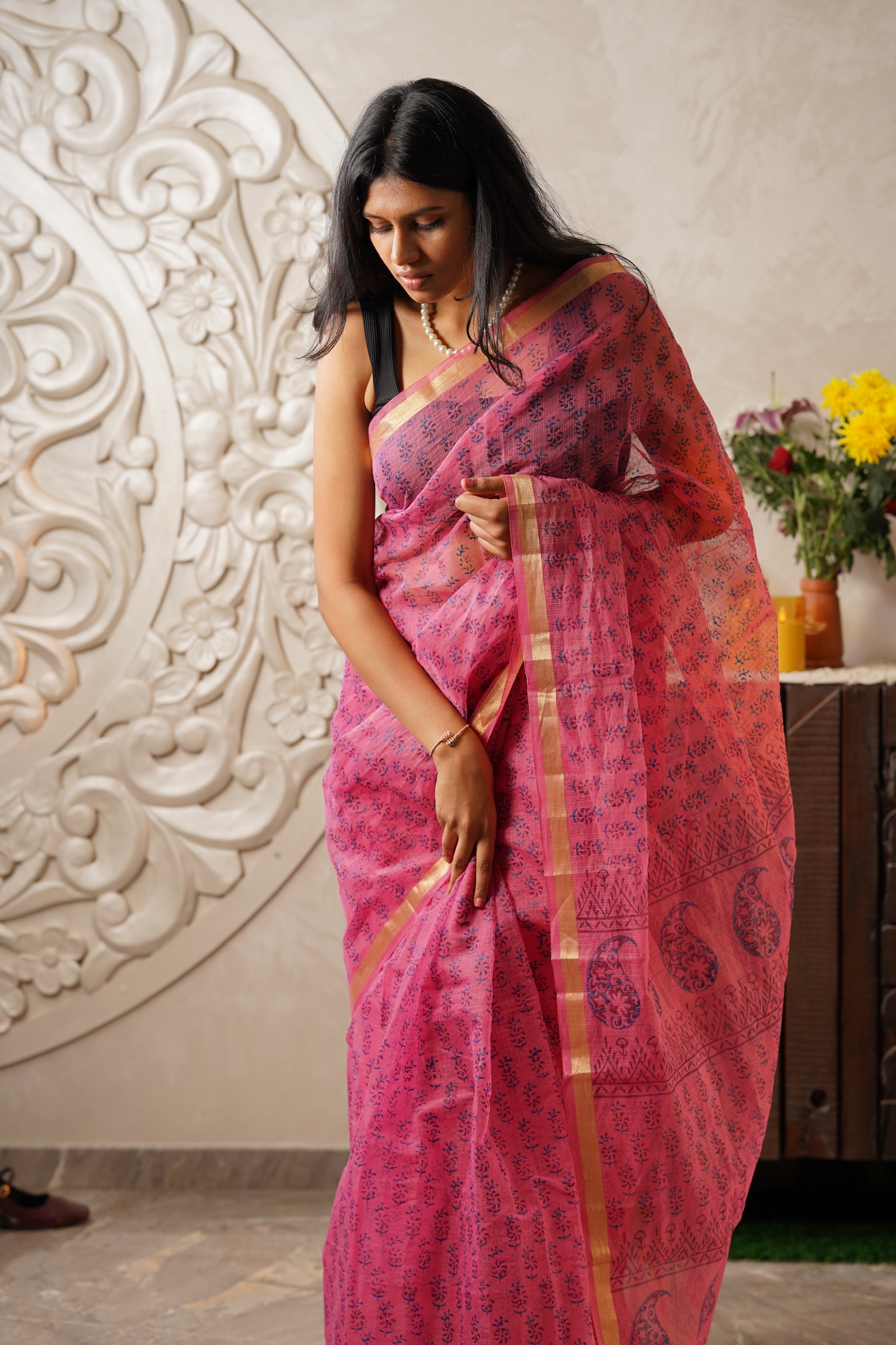 Gulabi Bagh of Kota Loom from the Bagh Dori collection captures the gentle charm of handwoven Kota textiles through colour, comfort, and craft.
