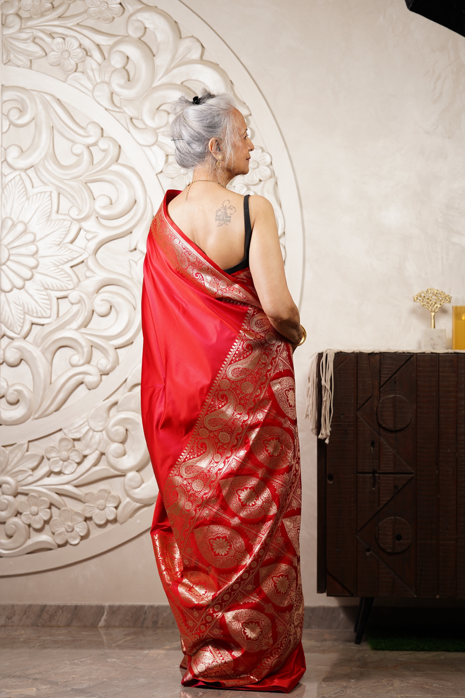 Woven by experienced artisans, this saree features a deep red silk base highlighted by intricate zari motifs and a statement pallu that adds depth and character to the drape. The detailed border and expansive weave reflect generations of craftsmanship, where precision and patience come together to create something truly timeless.